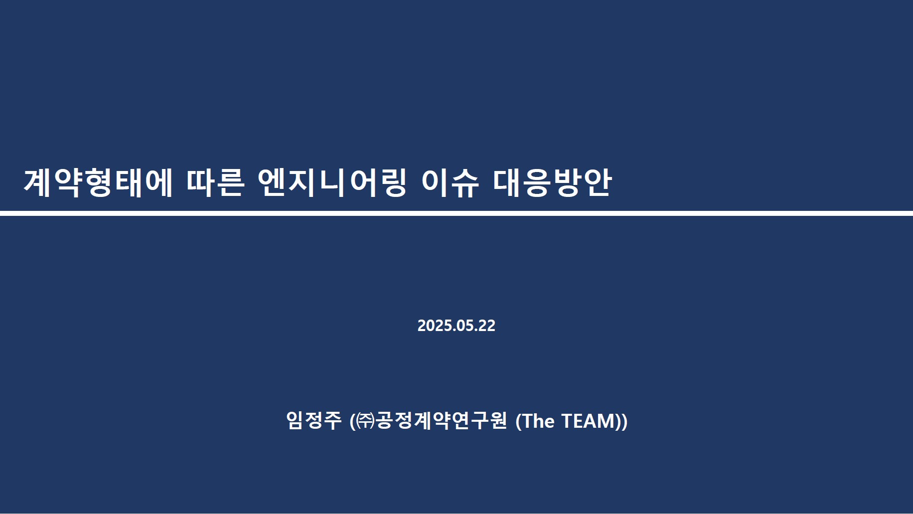 한국엔지니어링협회와 SCL Korea가 공동 개최한 세미나에서 임정주 대표가 발표한 계약형태에 따른 엔지니어링 이슈 대응방안 자료를 공유드립니다.
