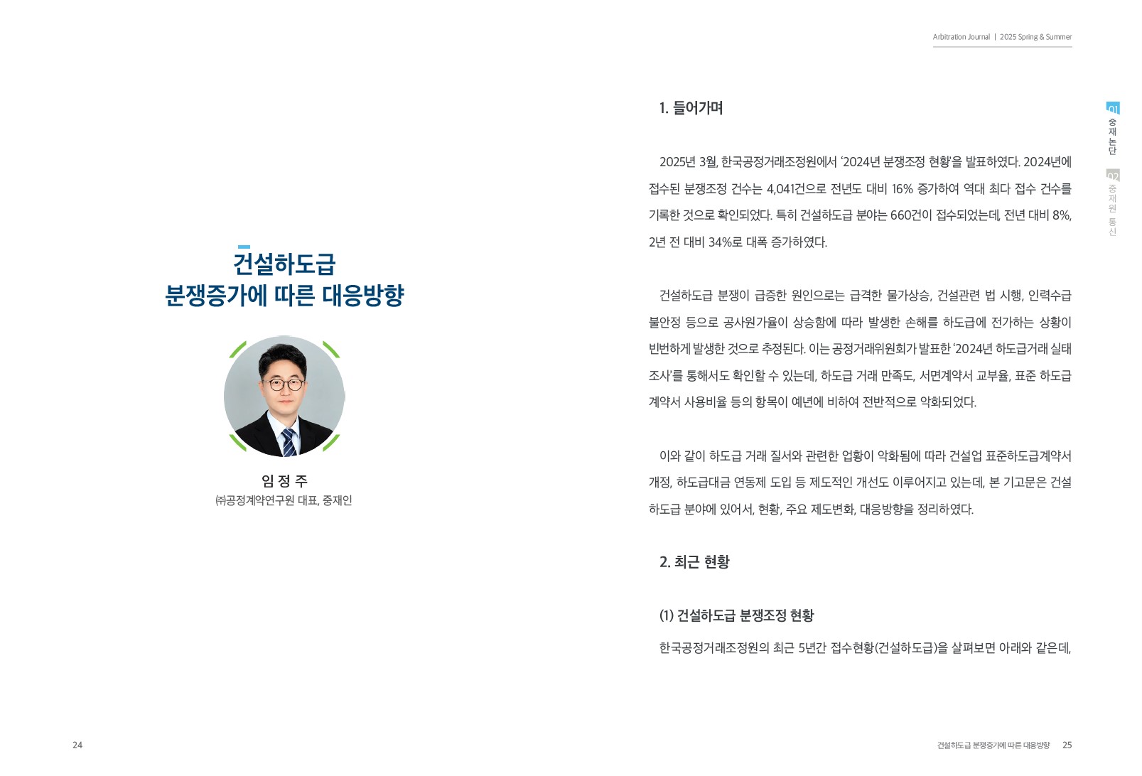 대한상사중재원이 발간하는 「중재」 2025년 봄·여름호에 임정주 대표는 건설하도급 분쟁증가에 따른 대응방향에 대해 기고하였습니다.