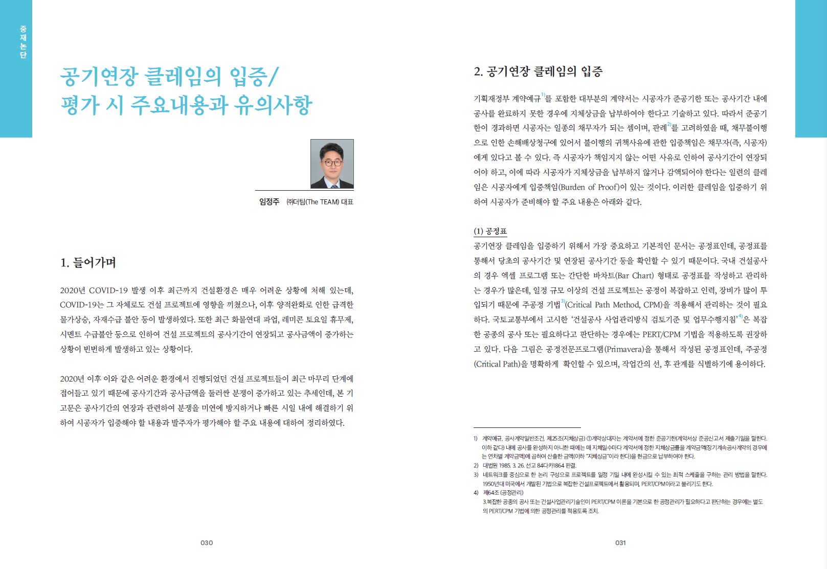 대한상사중재원이 발간하는 「중재」 2023년 봄·여름호에 임정주 대표는공기연장 클레임의 입증과 평가 시 주요 내용과 유의사항에 대해 기고하였습니다.