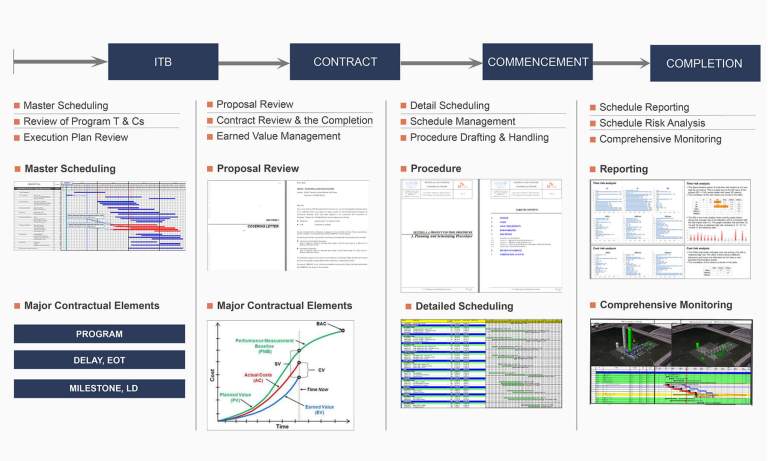(주)공정계약연구원 (The TEAM)은 기준공정표를 작성, 검토하고 프로젝트의 진행상태를 확인해서 월간공정표를 작성합니다. 또한 통합적인 관리를 통하여 영향을 발생시키는 이벤트로 인한 변경에 고객이 효과적으로 대응할 수 있도록 합니다.